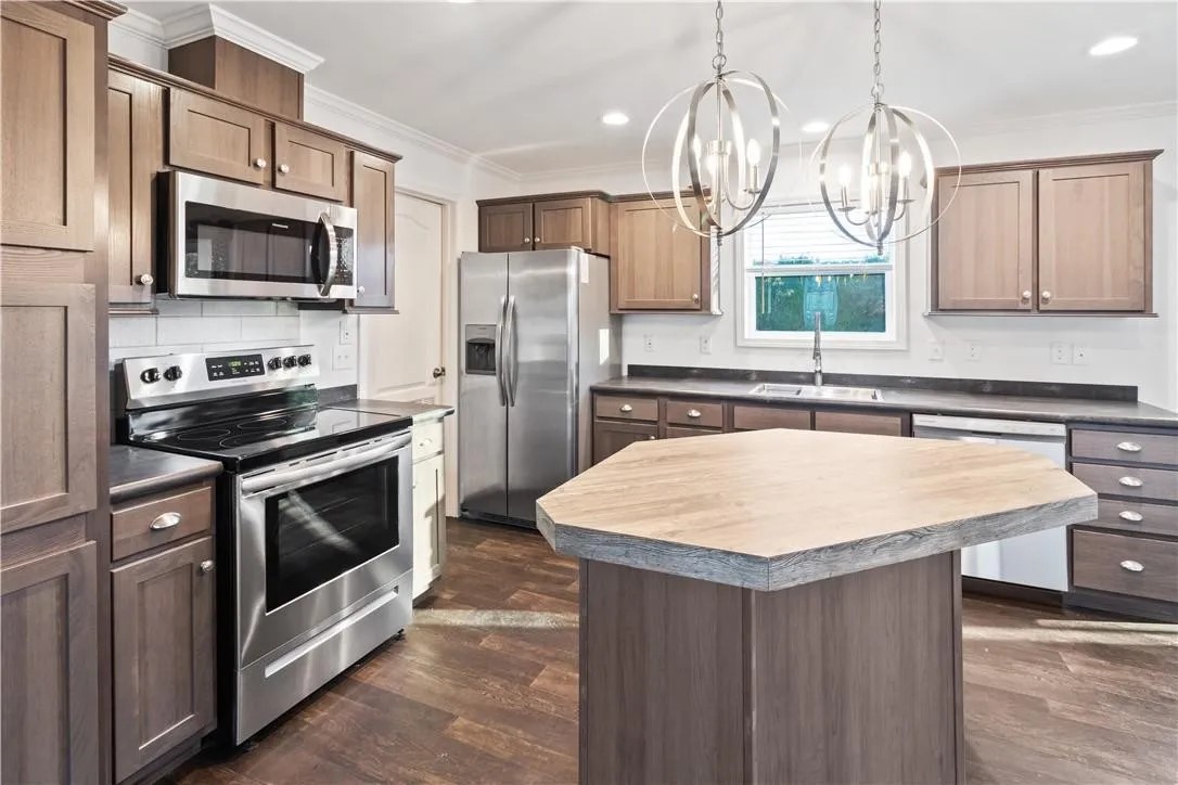 The dine-in kitchen boasts Frigidaire stainless steel appliances, silent close cupboards and drawers, a cook’s sink, and a center island for quick meals and conversation.